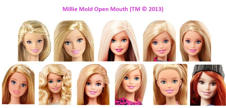 Aquí tenéis algunas muestras más del molde Millie Open Mouth, este molde se lanzó 3 años después del relanzamiento de Barbie de 2010. Con este molde se pretendía hacer el rostro de Barbie más amigable y dulce, de ahí la sonrisa enseñando dientes.